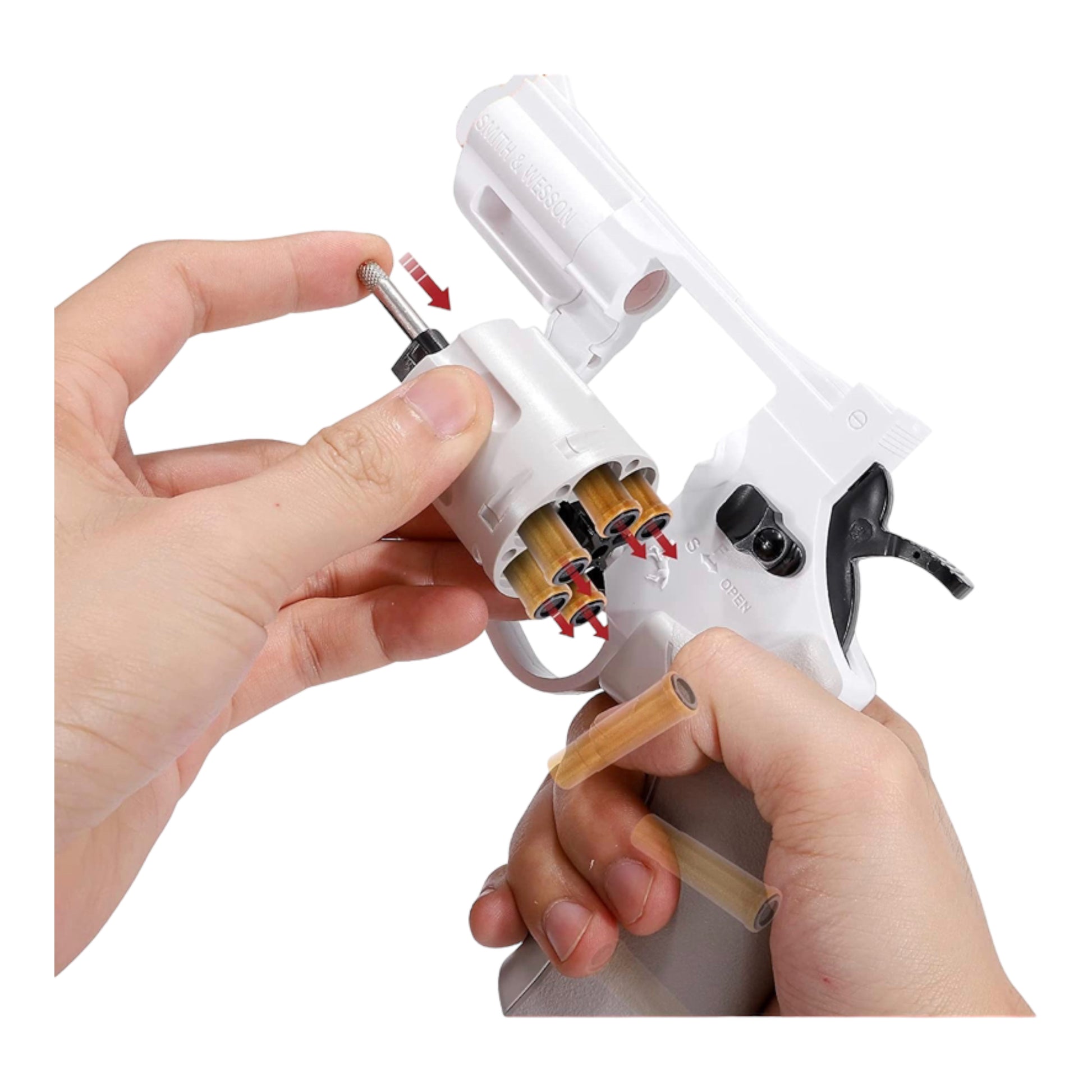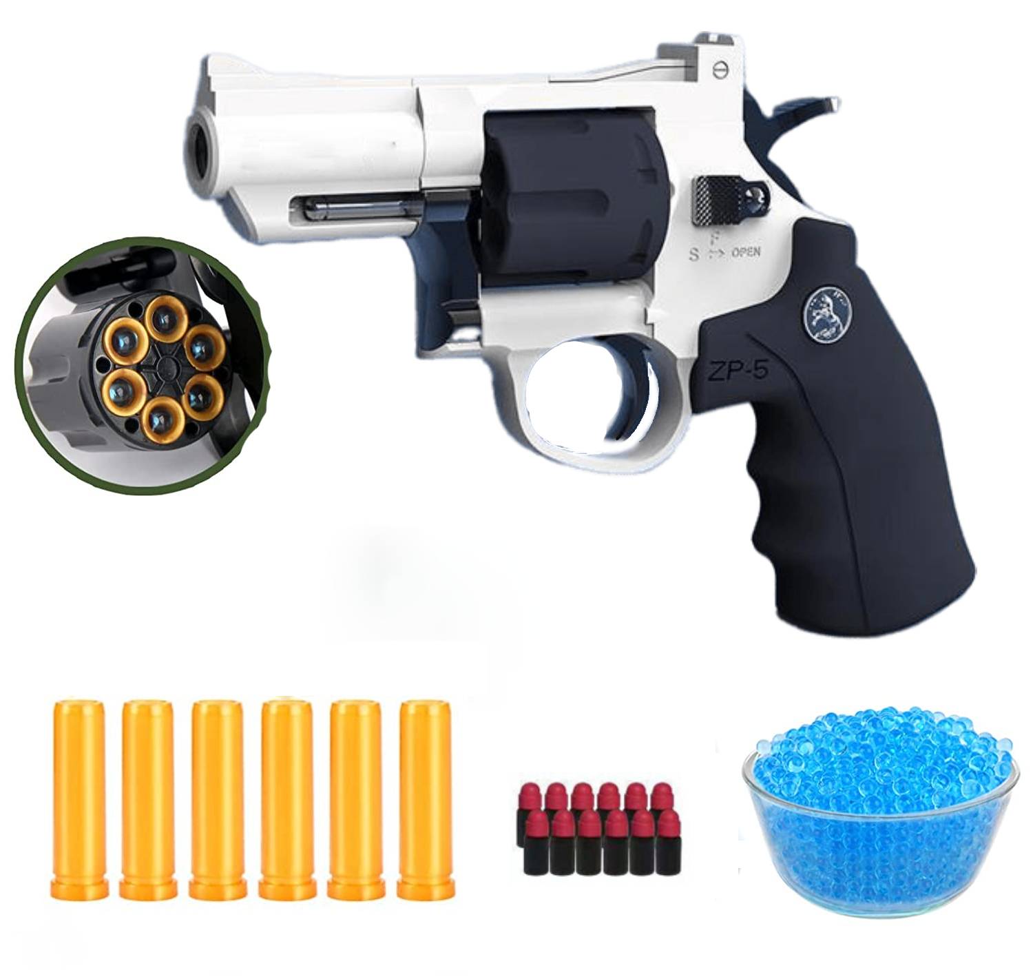 A simple yet reliable gel blaster revolver with ejecting shells, compatible with reusable foam darts