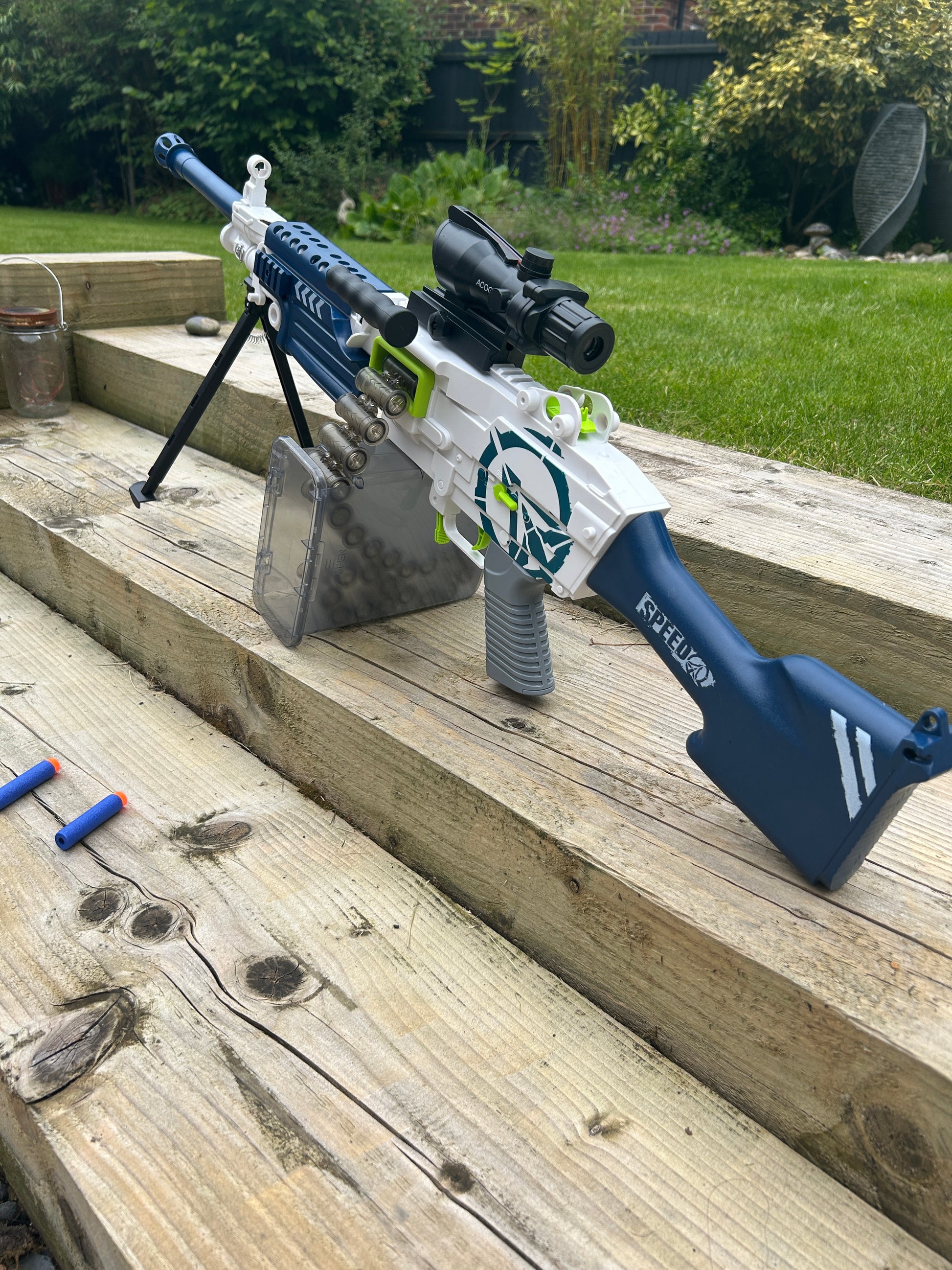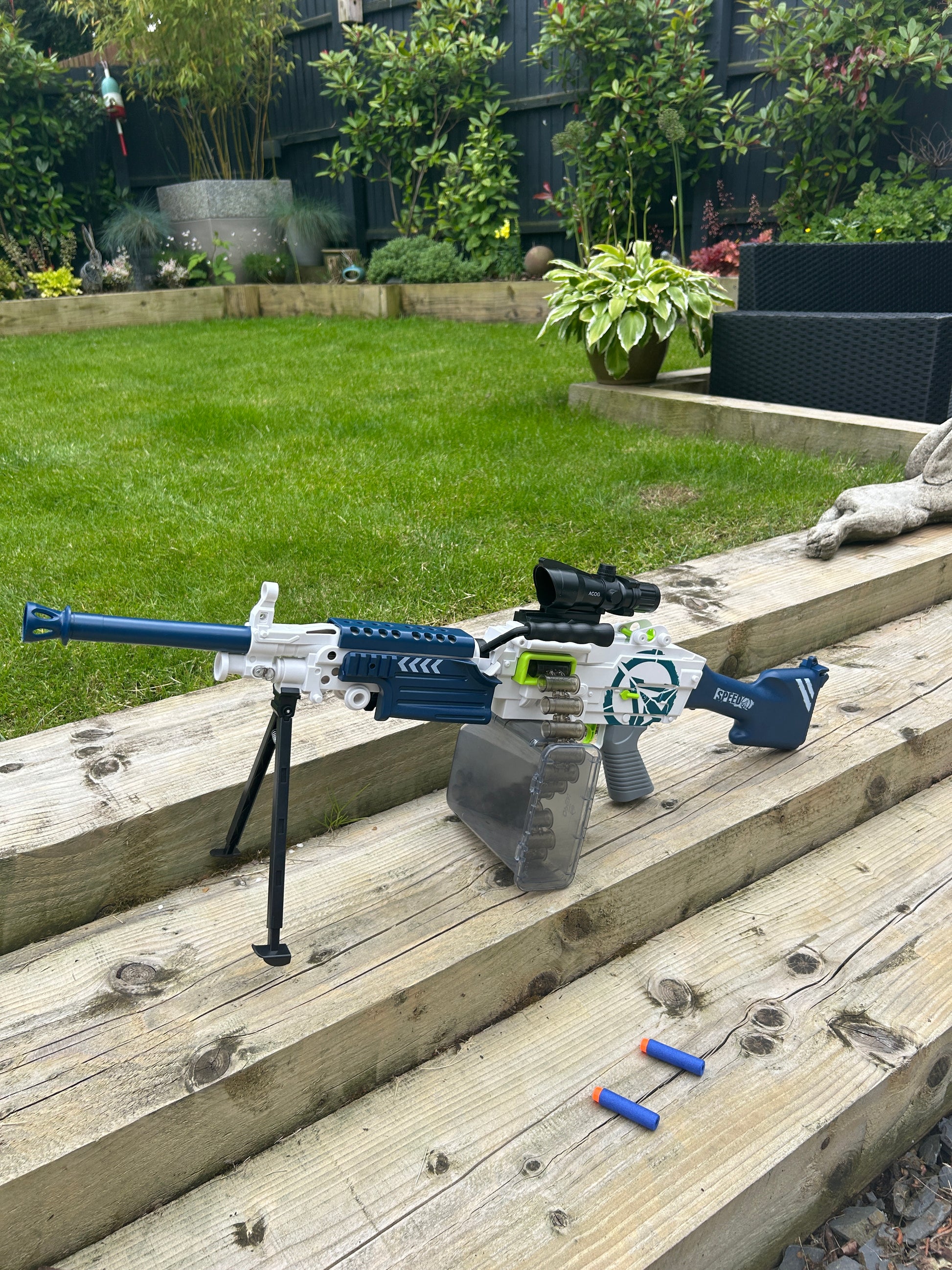 Includes battery/charger, belt loops, bipod, ACOG style scope and full set of darts.