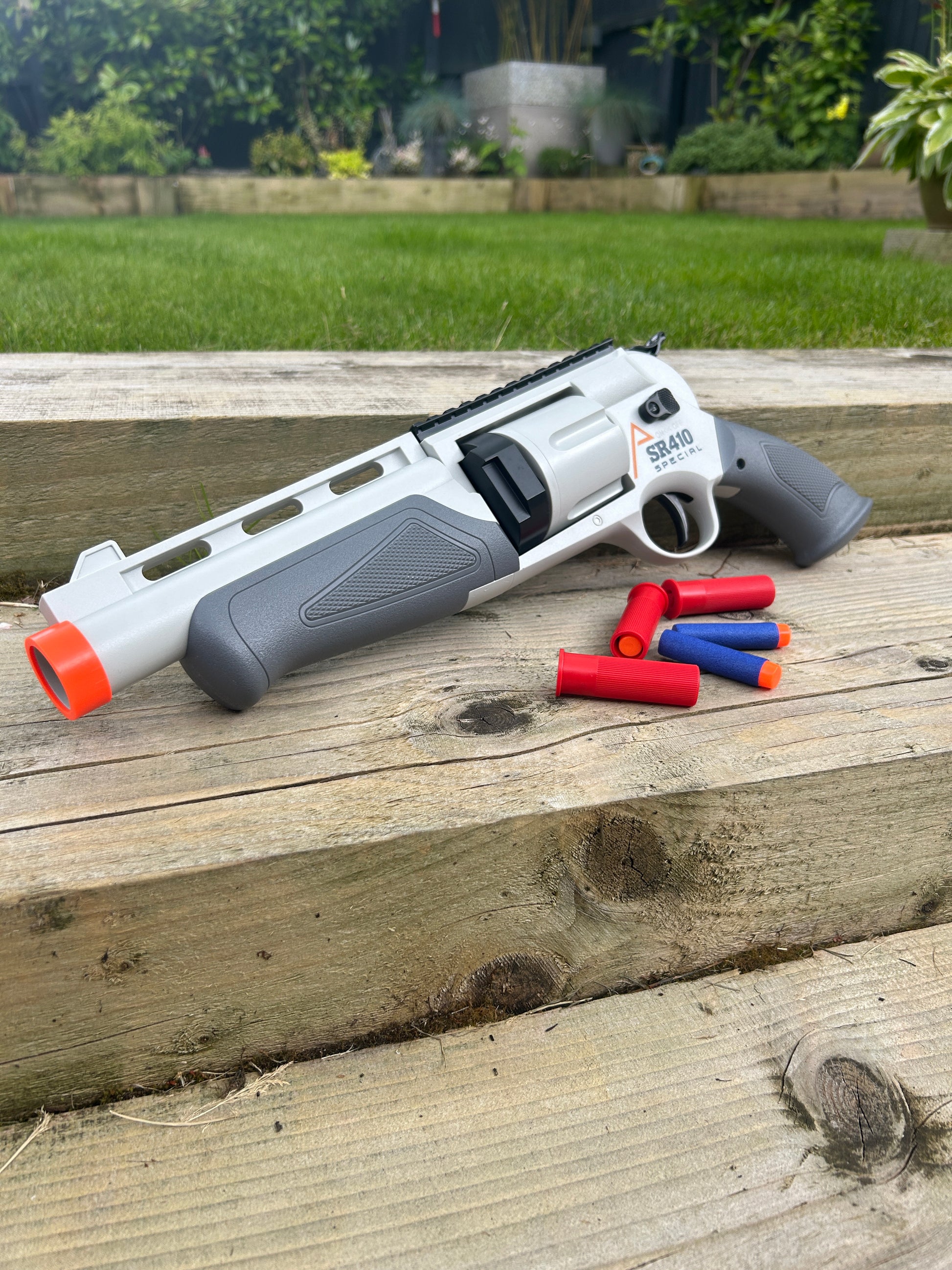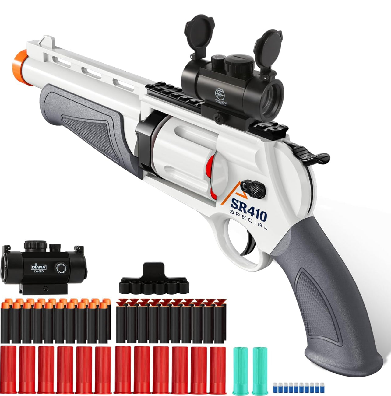 Complete with a 5 shell revolving cylinder and included optic, you can satisfyingly load the gun and target your opponents. Simply pull back the hammer to prime and fire.